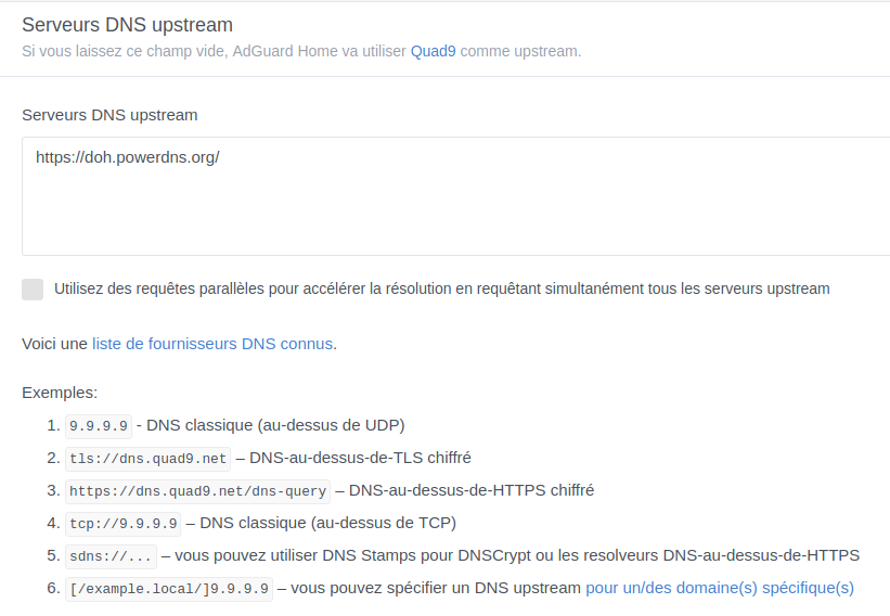Pour mettre en place le DOH, allez sur l'interface d'administration de AdGuard Home puis dans paramètres, paramètres DNS, renseignez le DOH de votre choix, dans mon cas, j'ai choisi